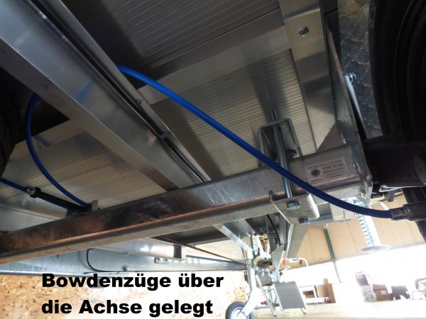 - Die Widerlager der Bremsseile sowie die Edelstahl-Bowdenzüge sind über der Achse dicht unter den Anhängerkasten verlegt, so daß sie bei Geländeeinsatz perfekt geschützt sind.