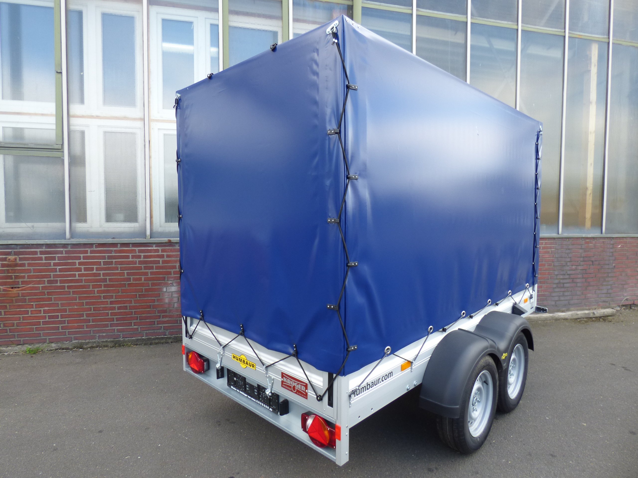 Kastenanhänger mit klappbarer Vorderwand und KRÖGER ProfiLine Hochplane in dunkelblau, Ladehöhe 160cm. Einmaliger Sonderpreis weil längere Zeit in Ausstellung gestanden.