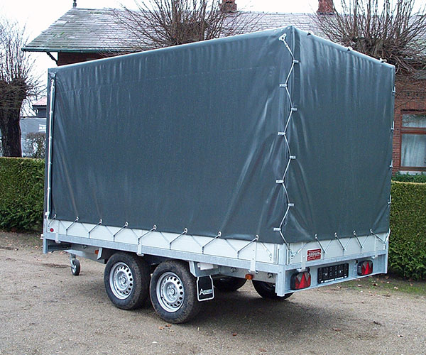 Eine Flachplane deckt die Ladefläche eines offenen Kastenanhängers ab.